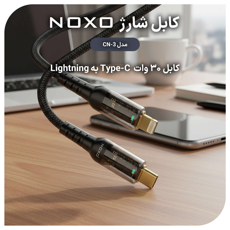 در کنار آن، کابل نوکسو مدل CN-3 با طراحی شفاف، LED نمایش وضعیت شارژ، طول ۱.۲ متر و روکش بافته شده تقویت شده ارائه می شود. این کابل از شارژ سریع PD تا توان ۳۰ وات پشتیبانی میکند و به دلیل وجود تراشه هوشمند E-Marker، جریان را دقیق و ایمن کنترل میکند . کانکتور Type-C به Lightning آن با تمامی دستگاههای اپل سازگار است، از جمله آیفون تا سری 14، آیپدها، ایرپاد و سایر محصولات دارای درگاه لایتنینگ.