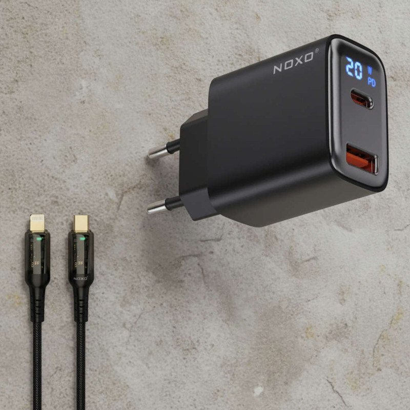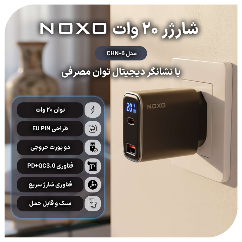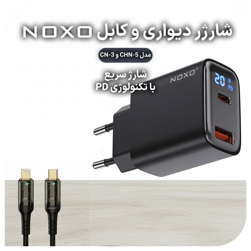 پک شارژر دیواری نوکسو مدل CHN-6 به همراه کابل Type-C به لایتنینگ مدل CN-3 یک مجموعه کامل و حرفه ای برای کاربران آیفون است. شارژر CHN-6 با توان ۲۰ وات و پشتیبانی از فناوریهای PD و QC3.0، امکان شارژ سریع و ایمن انواع گوشی، تبلت و دستگاههای سازگار را فراهم می کند. وجود نمایشگر دیجیتال هوشمند میزان توان خروجی و وضعیت شارژ را به صورت لحظهای نمایش می دهد. تراشه هوشمند داخلی نیز از دستگاه در برابر افزایش دما، اضافه جریان و اضافه ولتاژ محافظت می کند. دو پورت USB-A و USB-C این شارژر امکان شارژ هم زمان را فراهم کرده و با انواع دستگاههای اپل و اندروید سازگار است.